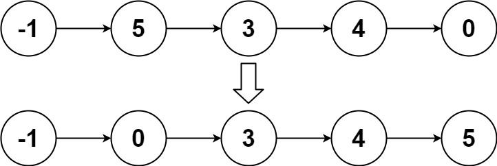 **输入:**head = [-1,5,3,4,0] 输出:[-1,0,3,4,5]